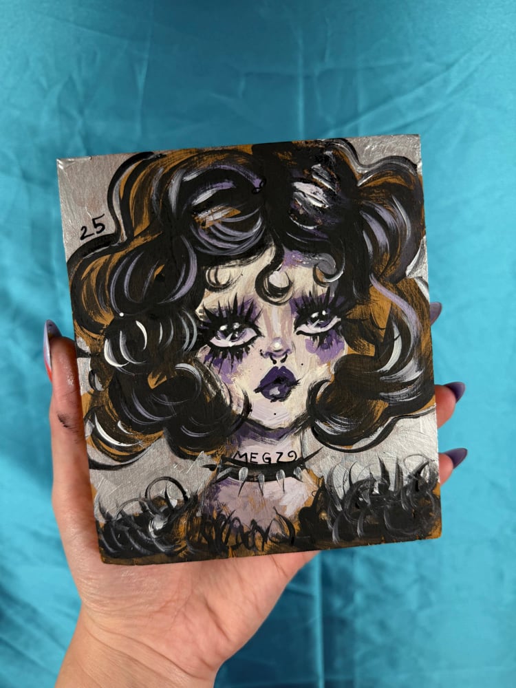 original painting on thrifted wooden board (approx 5x6”) - turned into a wall hanging